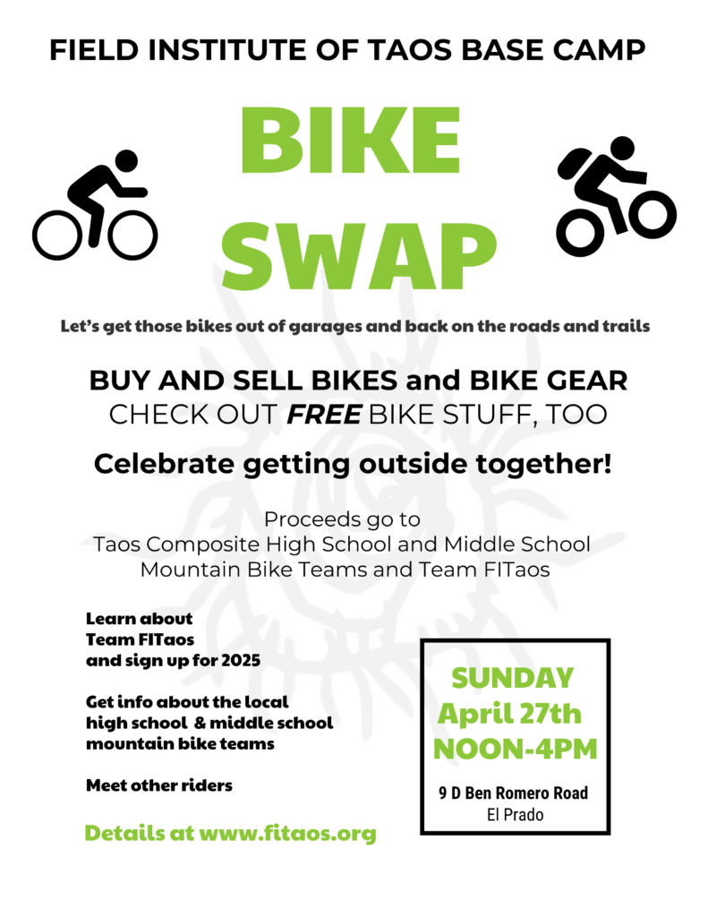 Bring your stuff to sell! You price and sell your own items. Requested 10% donation of sales to Team FITaos and Taos Composite (middle school and high school mountain bike teams). You can come set up at 11:30am or later. Swap begins at noon. Bring your own table, chair, or whatever you need.